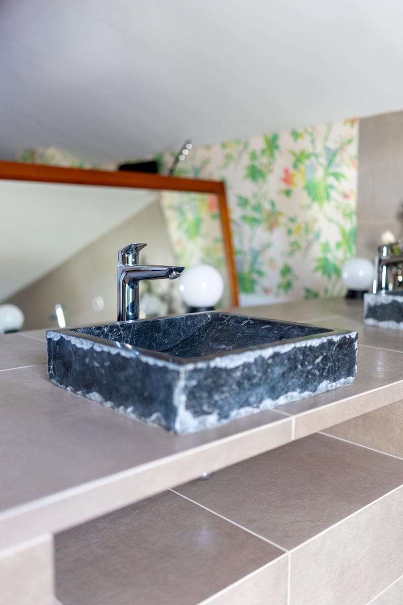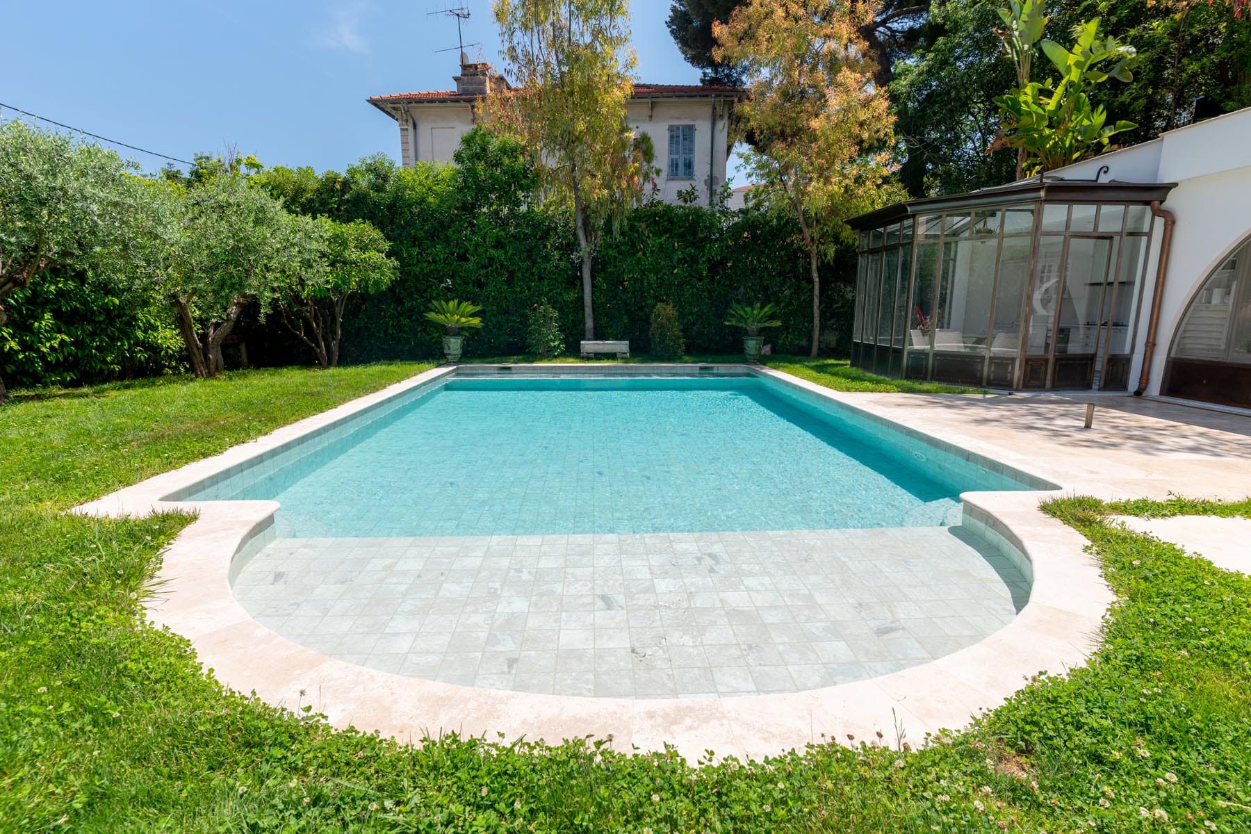 Une piscine intérieure en micro mosaïque aspect marbre au décor nid d'abeille, une piscine extérieure ardoisée beige associée à de la robinetterie et de la mosaique dorées, un vrai sans faute pour ce projet à Nice.
