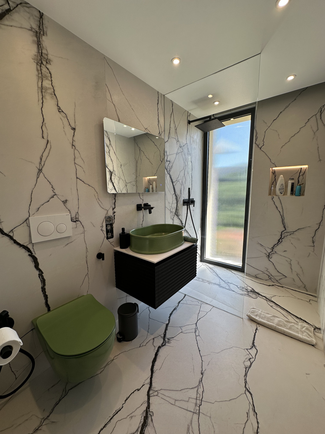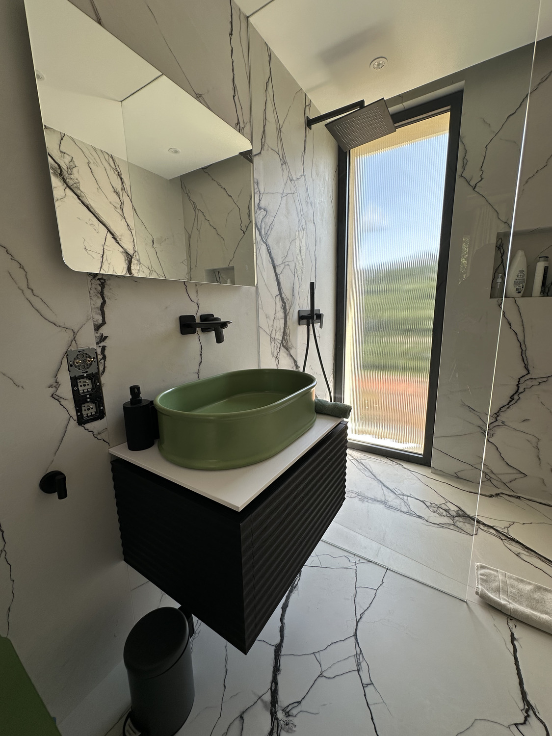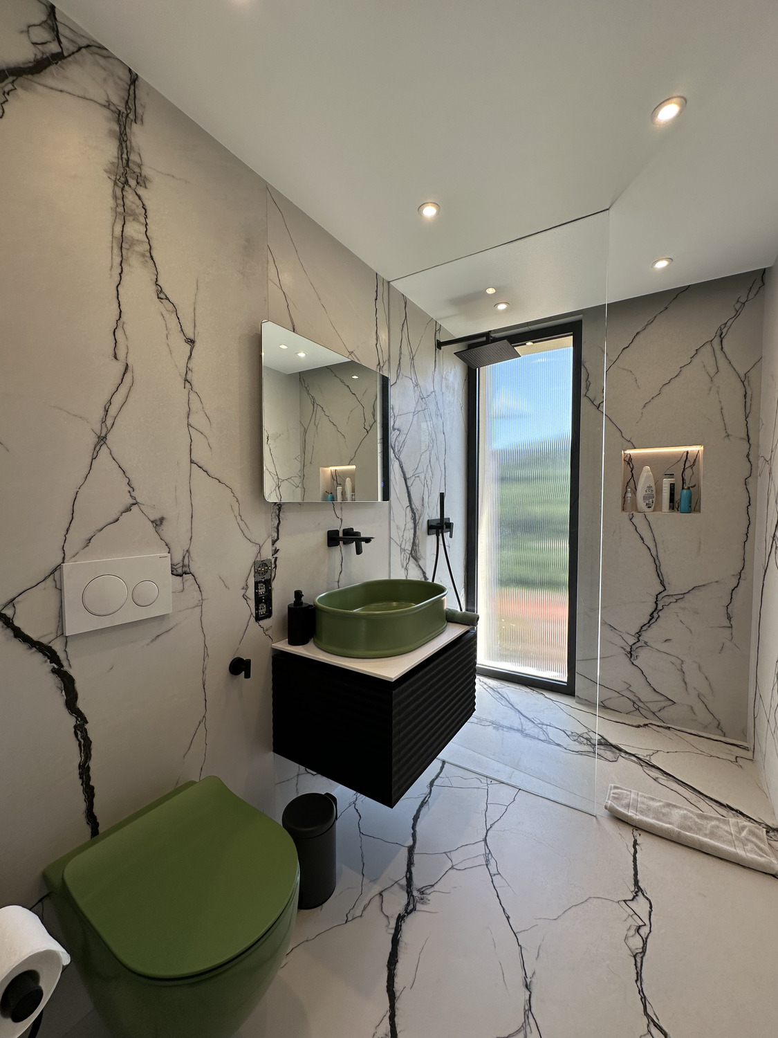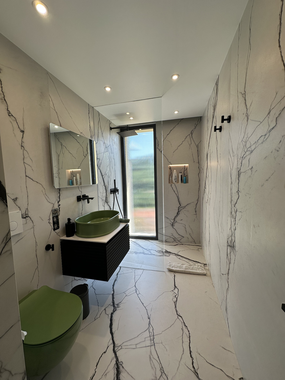 Black and white marble-effect tiles in this bathroom, paired with green cabinets for a contemporary and harmonious style. All materials come from La Maison par Carreau Concept, creating a fully bespoke and refined look.